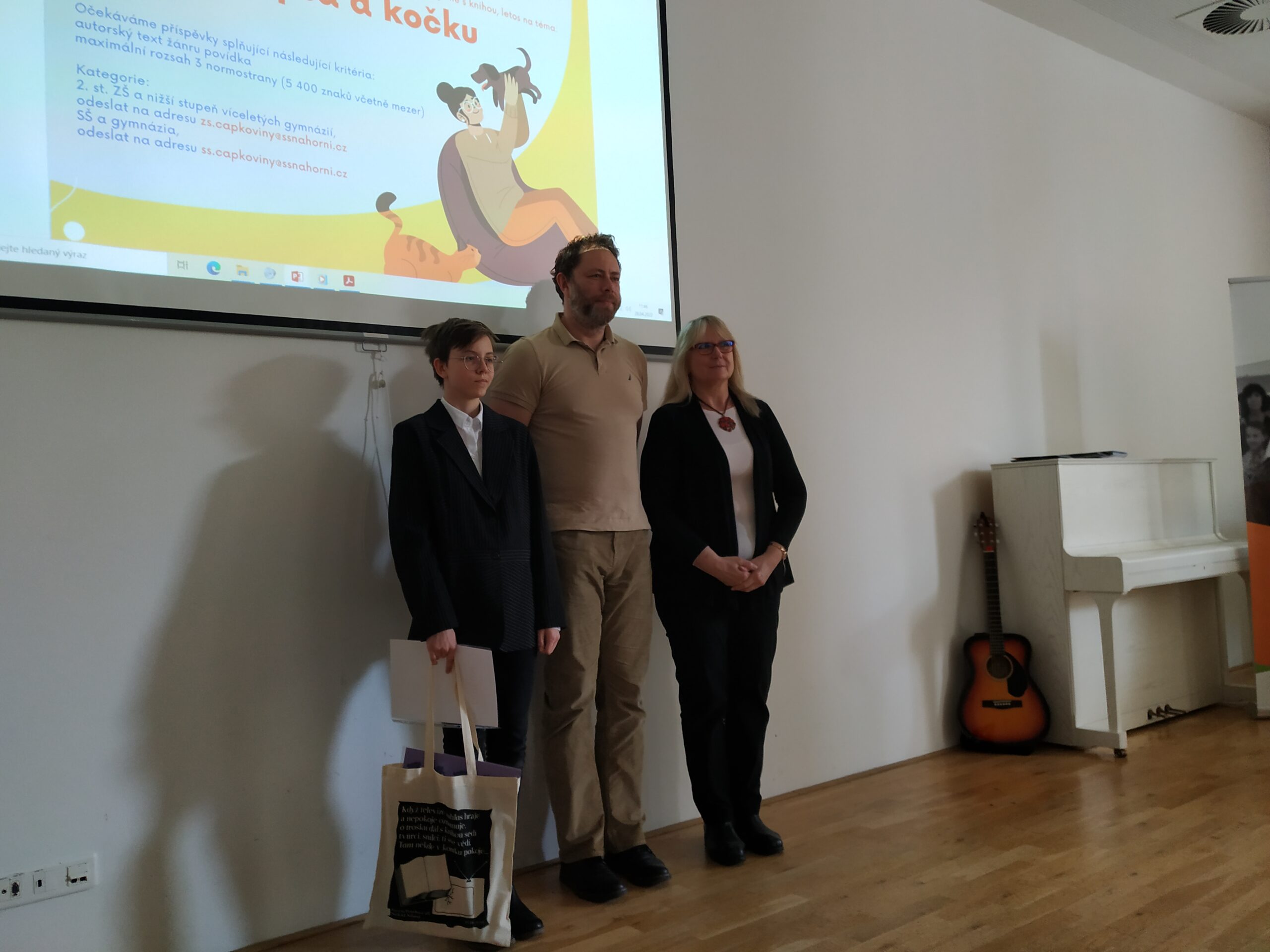 Hanka Kubeczková se vydala do Prahy, aby se zúčastnila slavnostního vyhlašování vítězů literární soutěže Čapkoviny. Její povídku Vražda kočky organizátoři omylem zařadili do vyšší kategorie. I tak se ale Hanka umístila na stupních vítězů a do své letošní literární sbírky úspěchů přidala 3. místo.