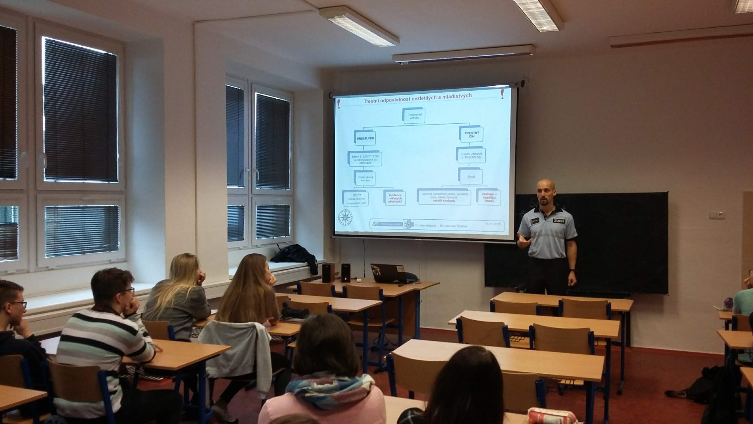 Jako každý listopad jsme i v letošním roce pro žáky pvního ročníku a kvinty připravili ve spolupráci s Policií ČR program Trestní odpovědnost nezletilých a mladistvých. Program se konal ve čvtrtek 15. listopadu během prvních čtyř vyučovacích hodin. Cílem programu bylo seznámit žáky s jejich trestní odpovědností a naučit je rozeznávat, jaké chování je v mezích zákona a jaké je naopak za jeho hranicemi. Vysvětlit jim pojmy přestupek a trestný čin a seznámit s postihy za protiprávní činy v jejich věku.