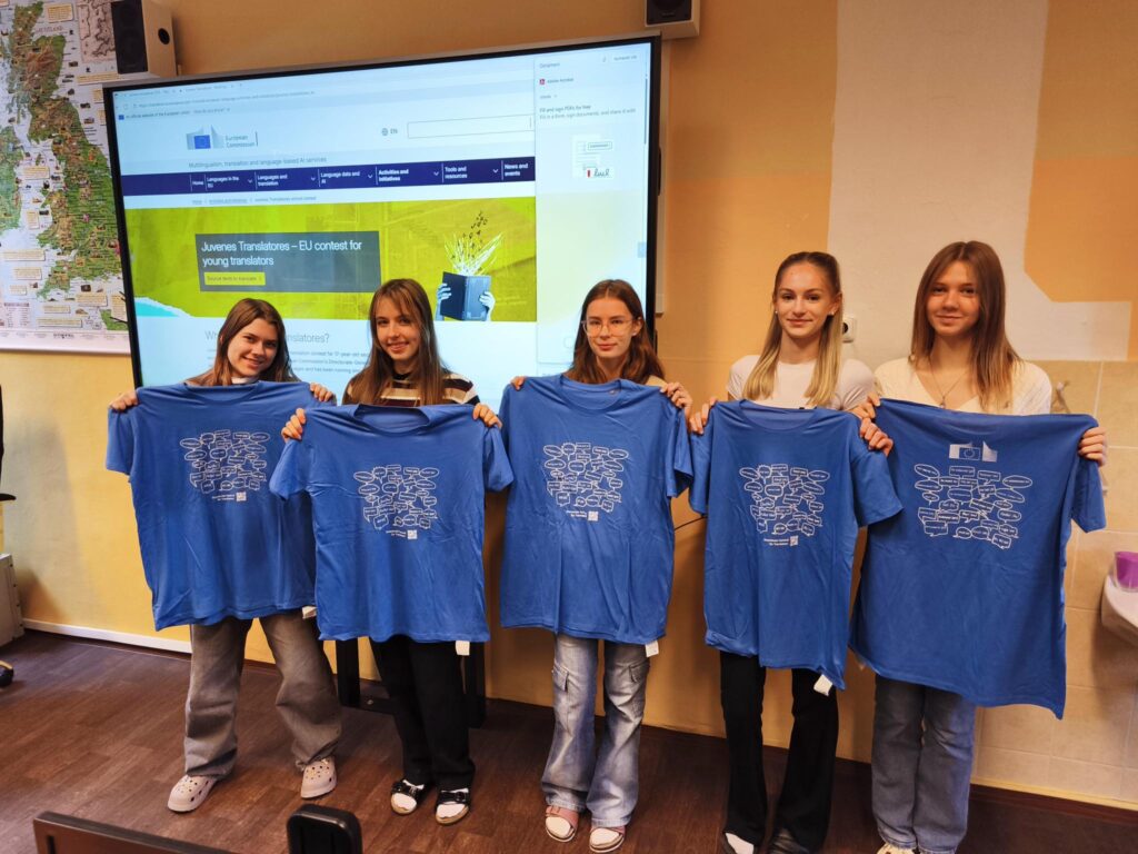 Náhodným vylosováním ze všech přihlášených škol jsme letos byli vybráni k účasti na mezinárodní online soutěži pro mladé překladatele. O co jde? Tuto soutěž již od roku 2007 pořádá každoročně Generální ředitelství pro překlady Evropské komise ve školách po celé Evropské unii. Je to skvělá šance vyzkoušet si práci překladatele, motivuje to žáky ke studiu cizích jazyků, což může některé z nich inspirovat ke kariéře profesionálních překladatelů. Každý rok se akce účastní na tři tisíce studentů ze 700 škol po celé EU. Z každé členské země bude vybrán vítěz a všech 27 nejlepších se pak setká v březnu 2026 v Bruselu na slavnostním předání cen. Skupinka 5 mladých překladatelek z naší školy se ve čtvrtek 27. listopadu 2025 snažila o co nejlepší převod textu z anglického a německého jazyka do češtiny. Jako poděkování dostaly od pořadatelů pěkná trička s pozdravy ve všech 24 úředních jazycích EU. Držíme palce, třeba to vyjde…