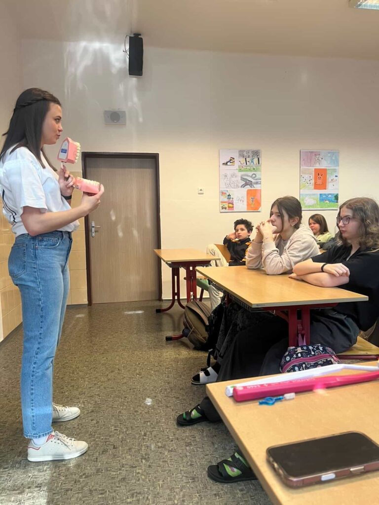 Studentky nejprve žákům vysvětlily, proč je pravidelná a správná péče o zuby důležitá pro celkové zdraví. Poté představily jednotlivé pomůcky, které při každodenní péči o chrup používáme. Velká část programu byla věnována praktickým ukázkám správného čištění zubů. Žáci si tak mohli pod vedením studentek vyzkoušet jednotlivé techniky a zeptat se na vše, co je zajímalo.