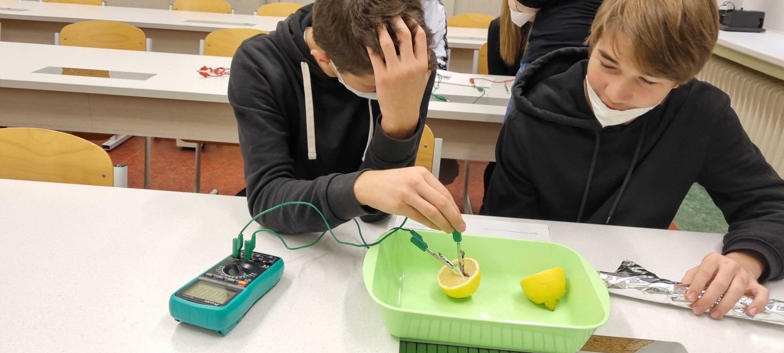 Ve fyzice si žáci měli možnost vyzkoušet sestavit obvod, kdy jediným zdrojem napětí byl citrón a vhodně zvolené 2 různé kovy. Multimetrem měřili napětí, které takto vznikne při kombinaci alobalu a desetikoruny, desetikoruny a pětikoruny a také alobalu a pětikoruny. Na dalším stanovišti sestavili grafitový dělič napětí a vyzkoušeli si, jak jednoduše jde snížit napětí na spotřebiči pomocí tužkou nakreslené čáry. Poslední úloha se týkala rovnováhy na páce. Vyvážit různá závaží na jedné straně páky nebyl vždy úplně snadný úkol, přesto to žáci bravurně zvládli.