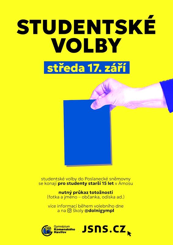 Ve středu 17. září 2025 se na naší škole uskuteční Studentské volby do Poslanecké sněmovny Parlamentu České republiky. Volby proběhnou v Ámosu a zúčastnit se jich mohou všichni studenti starší 15 let. Cílem je seznámit studenty s průběhem hlasování a umožnit jim získat cennou zkušenost ještě před jejich prvními oficiálními volbami.