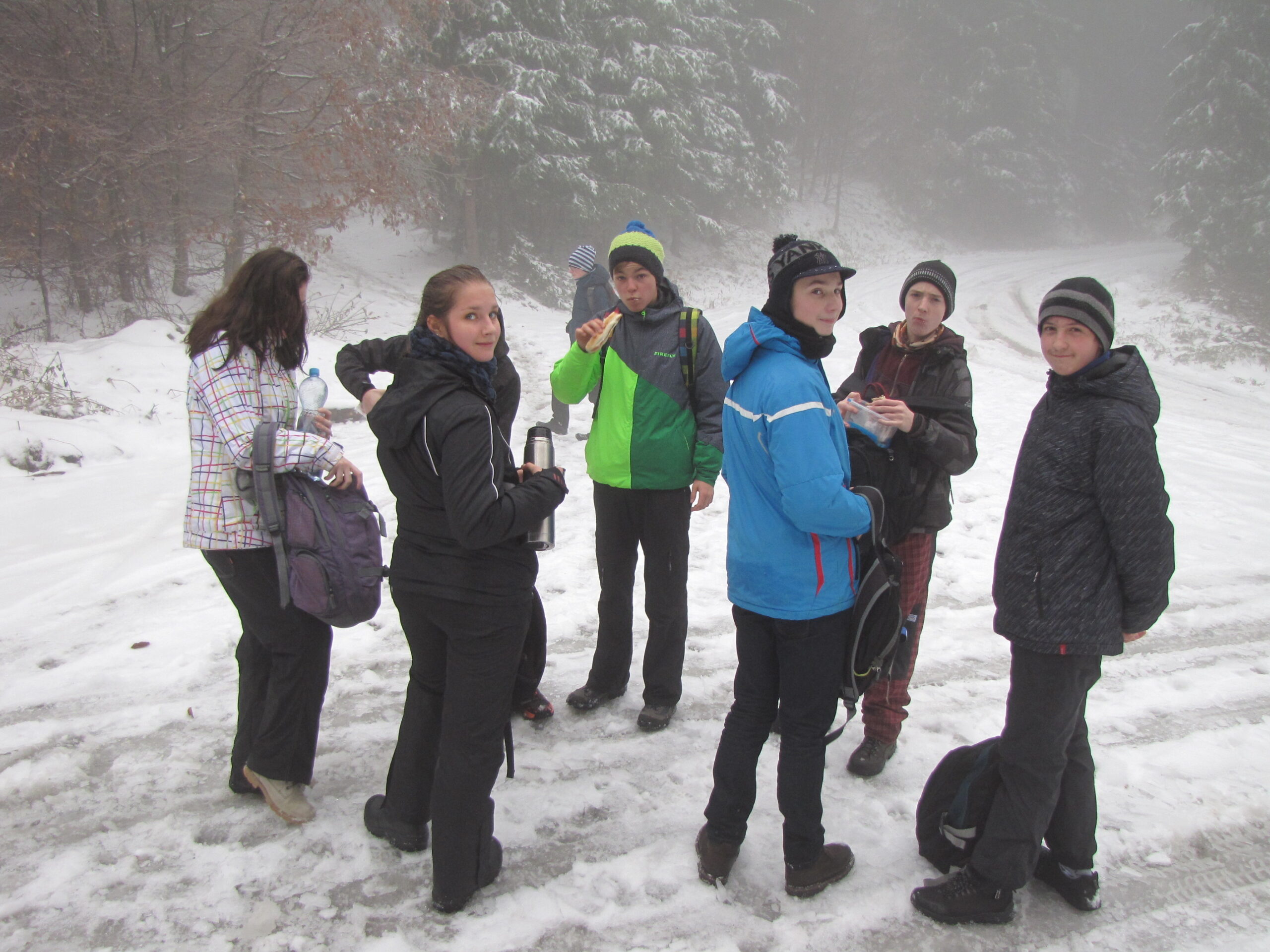 Následný 9 kilometrový výstup nebyl úplně jednoduchý, neboť na Svatého Martina nasněžilo. To nás ale neodradilo, protože výhledy na krajinu za to stály, i když byly občas zastřeny mlhou. Nahoře jsme se zahřáli polévkou, doplnili zásoby pití a hned potom jsme vyrazili na sestup směrem k obci Ostravice.