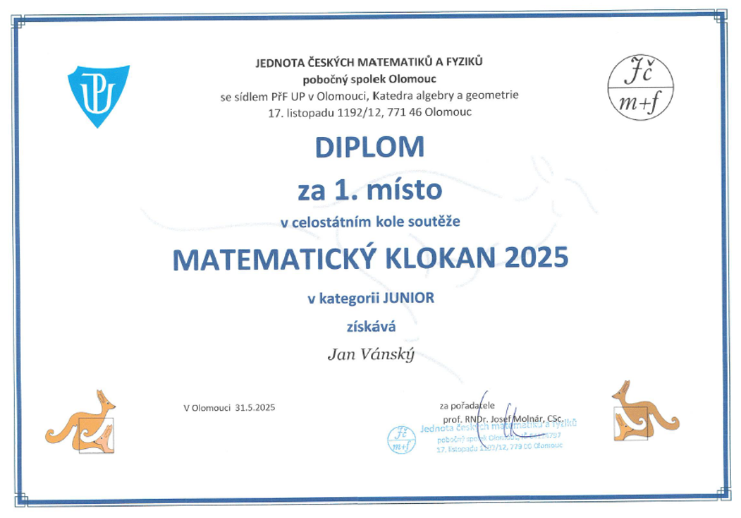 Jan Vánský z 2. B obsadil s dalšími čtyřmi studenty z ČR 1. místo v celostátním kole soutěže Matematický klokan. Dosáhl maximálního počtu bodů.