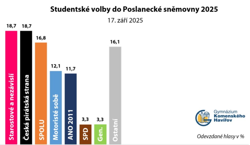 Dne 17. září 2025 proběhly na naší škole Studentské volby do Poslanecké sněmovny Parlamentu ČR. Volby, které jsou určeny studentům středních škol starších 15 let, tradičně zaštiťoval vzdělávací program Jeden svět na školách (JSNS). Studenti vybírali z 26 politických stran, hnutí a koalic.